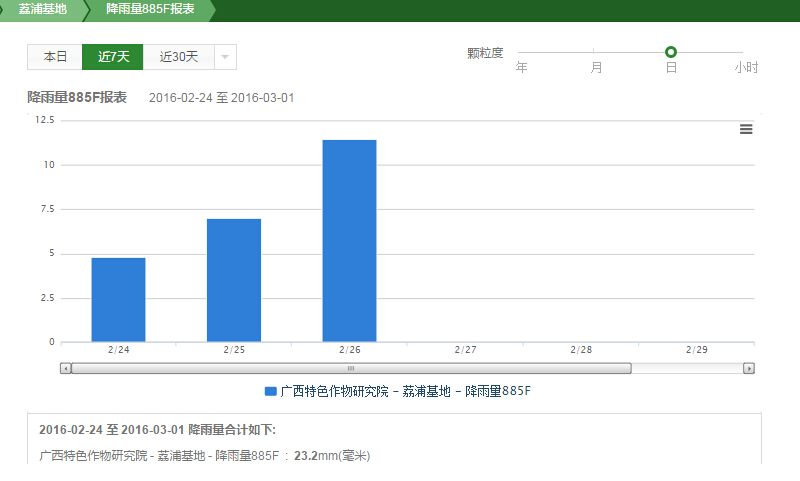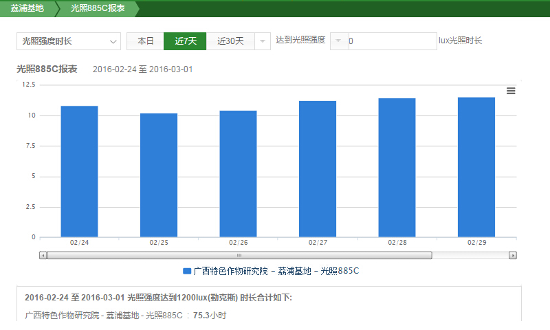 廣西特色作物研究院前身是創(chuàng)建于1965年的廣西柑桔研究所,對(duì)柑橘、砂糖橘等農(nóng)產(chǎn)品的品種培育、種植等具有先進(jìn)的科研水平。荔浦作為全國(guó)砂糖橘第一縣,其大面積推廣種植的背后離不開科學(xué)的作物研究。尤其是砂糖橘果樹生長(zhǎng)發(fā)育、開花結(jié)果與溫度、日照、水分(濕度)、土壤以及風(fēng)、海拔、地形和坡向等環(huán)境條件緊密相關(guān),這些條件影響最大的數(shù)溫度,即使差異0.5℃的氣溫有時(shí)會(huì)出現(xiàn)截然不同的結(jié)果。因此,對(duì)一線數(shù)據(jù)如作物生長(zhǎng)環(huán)境數(shù)據(jù)(光照、降雨量、土壤溫濕度、空氣溫濕度)、作物生長(zhǎng)過程數(shù)據(jù)進(jìn)行采集、分析,是非常重要的工作。為了更好開展砂糖橘的科研工作,2015年始,廣西特色作物研究院借助天潤(rùn)智力智慧農(nóng)業(yè)云平臺(tái)智能農(nóng)業(yè)監(jiān)控系統(tǒng),進(jìn)一步加強(qiáng)對(duì)作物基礎(chǔ)數(shù)據(jù)的采集分析,以使科研工作更科學(xué)精準(zhǔn)。