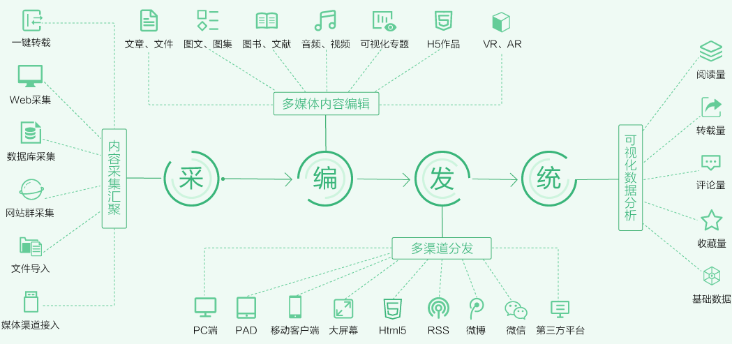 提供包括一鍵轉(zhuǎn)載、文件導入、Web采集、數(shù)據(jù)庫采集、網(wǎng)站群采集、媒體渠道接入等在內(nèi)的多種內(nèi)容采集方式,全面整合針對性創(chuàng)意選題收集和傳統(tǒng)媒體約稿,為后期媒體傳播提供全面完整素材。
