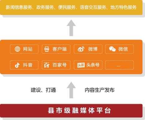 快速建設或打通媒體多端,并支持多端的內(nèi)容生產(chǎn)和發(fā)布,基于多端面向受眾群體提供新聞信息服務、政務服務、便民服務、語音交互服務、地方特色服務。