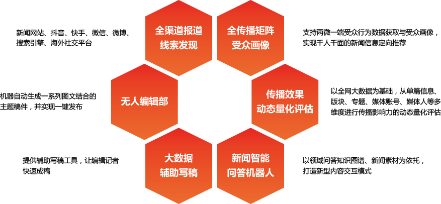 基于我們的大數(shù)據(jù)和AI技術,將智能化貫穿融媒體平臺整個環(huán)節(jié),實現(xiàn)大數(shù)據(jù)智能選題、智能輔助寫稿、自動生成專題、新聞機器人交互、傳播效果實時量化測評。