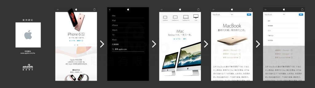 Apple選單使用跳頁方式呈現(xiàn),在選擇產(chǎn)品大分類后,進(jìn)入該類別的專頁,不使用相同的選單樣式,而選擇使用橫式滑塊,并使用分類圖做搭配,在第三層產(chǎn)品介紹項目頁面中,使用第二階層下拉選單。他將每一層做區(qū)分,并針對每一層的不同需求,而對應(yīng)不同的選擇方式。