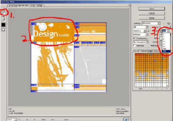 我們來看看紅線所標(biāo)識(shí)的1.2.3部分,將1所示的切片工具選中,然后點(diǎn)選2所示的圖片,在3所示的地方選擇色值,如果色彩單一可以選擇盡量小的色值位;設(shè)置好之后輸出文件,文件里包括htm和image的文件夾。到這里頁(yè)面就算完成一半。